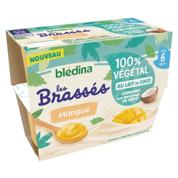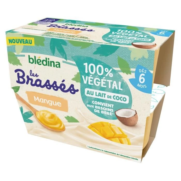 du produitDites bienvenue aux petits derniers de la famille blédina 100 % VEGETALLa mission blédina ?Faire de bébé le champion de l’alimentation diversifiée !En effet, nous sommes convaincus que c’est en mangeant un peu de tout que l’on pose les bonnes basespour aujourd’hui et pour demain.Varier les plaisirs, ça a du bon !Ces brassés 100 % VEGETAL, ce sont de délicieuses recettes de dessert pour bébé adaptées à bébé1 pour continuer à éveiller ses papilles et sa curiosité.Le petit + ?Convient également aux enfants allergiques aux protéines de lait de vache.Et vous savez quoi ?Nos brassés 100 % végétal sont préparées avec amour par des femmes et des hommes passionnés du bienmanger.1Conformément à la règlementation de l’alimentation infantileDessert végétal bébé 6 mois