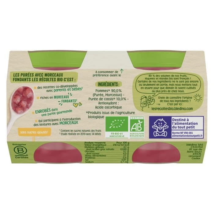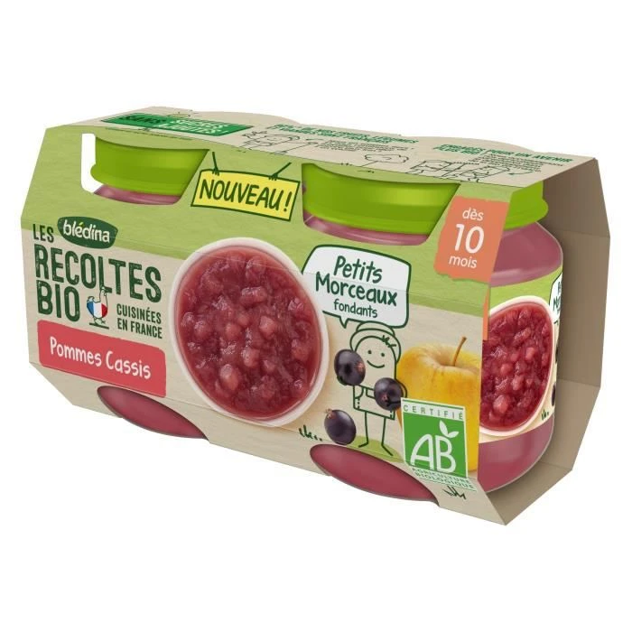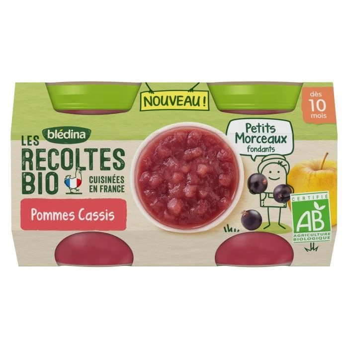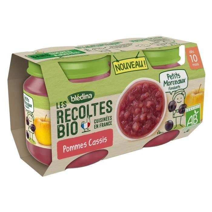 Blédina Les Récoltes Bio, Petits Pots Pour Bébé Bio Dès 10 Mois, Pommes Cassis Petits Morceaux, 2x130g