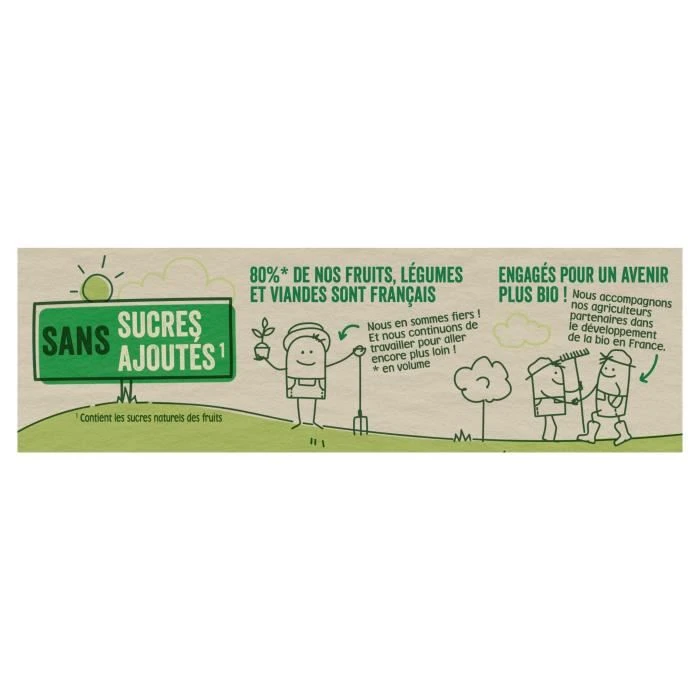 IngrédientsIngrédients : Pommes* 90,0 % (Purée, Morceaux) – Purée de cassis* 10,0 % – Antioxydant : Acide ascorbique. *Produits issus de l’agriculture biologique.
