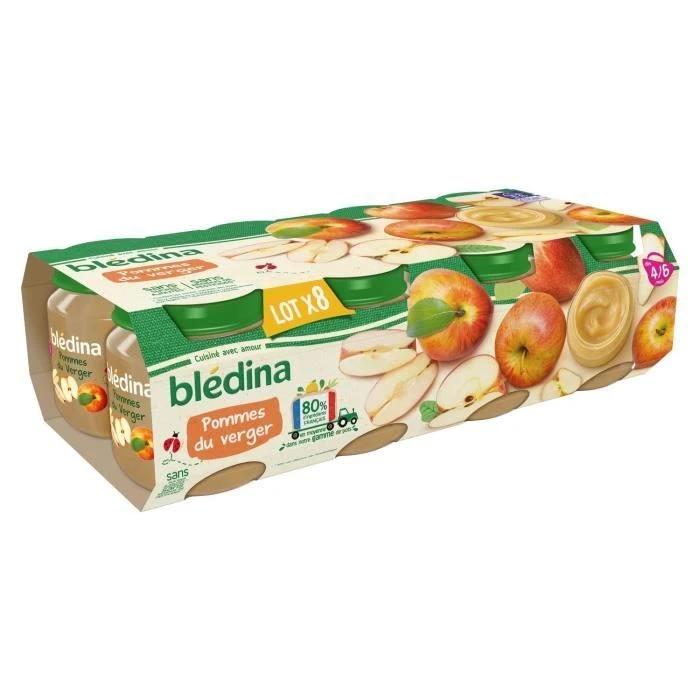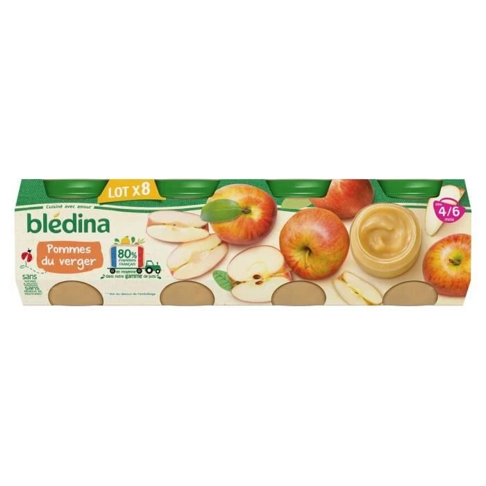 BLEDINA Petits Pots Bébé, Dès 4/6 Mois, Pommes du Verger, 8x130g – Avec sa texture lisse, ce petit pot est idéal pour les 1ères cuillères de bébé et pour lui faire découvrir le goût des fruits dans une recette simple – Les fruits blédina sont spécialement cultivés pour les tout-petits, selon des règles très strictes, et sont soigneusement cueillis au rythme des saisons – 80% de nos ingrédients sont français en moyen