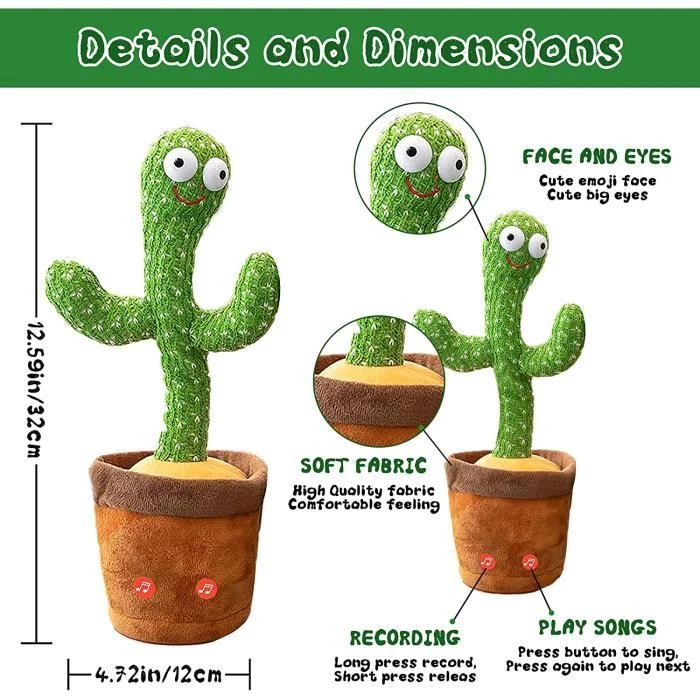 🌵Dancing cactus :Le cactus peluche lumineuse peut danser, chanter (120 chansons), bouger, tourner, faire briller, enregistrer et parler.Cactus peluche musicale qui peut être tourné pour chanter et danser et faire rire votre famille et vos amis.
