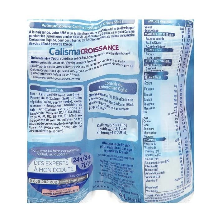 Conseils de dégustationA partir d’un an et jusqu’à 3 ans au moins, les pédiatres recommandent de consommer 500 ml/jour d’aliment lacté pour enfants en bas âge. Calisma Croissance contribue à couvrir les besoin nutritionnels des bébés à partir d’un an, dans le cadre d’une alimentation diversifiée. De la vitamine C qui contribue au bon fonctionnement du système immunitaire,- Du fer qui contribue au bon développement cérébral,Il est important pour votre enfant d’avoir une alimentation variée et équilibrée. Un format liquide pratique prêt à l’emploi!