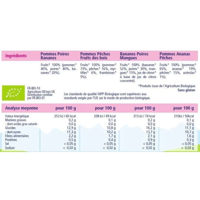 Purée de fruits biologique adaptée à l’enfant : Pommes Poires Bananes, Pommes Pêches Fruits des bois, Bananes Poires Mangues, Pommes Ananas Pêches.