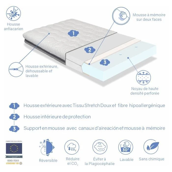 Matelas Bébé Kala – 70x140cm + Plan Incliné 15° – Epaisseur 11cm – Déhoussable Et Lavable