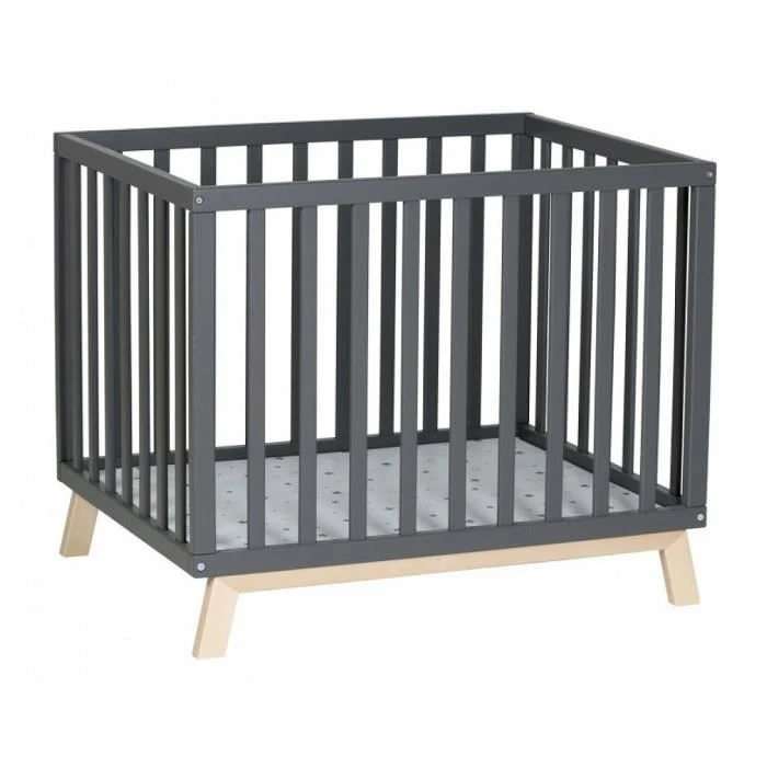 Parc d’enfant Holly anthracite/naturel laqué feuille gris étoilé. Ce beau parc est parfait pour garder votre enfant. Sa base rembourrée de mousse PU et réglable sur 2 hauteurs pourra s’adapter au bébé tout au long de sa croissance. Sa structure en hêtre massif laqué gris anthracite avec des pieds bois clair est solide et votre enfant pourra dormir et jouer.75 x 100 cm de Schardt, fabriqué en Allemagne.