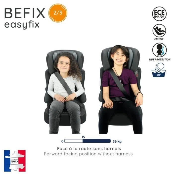 Le siège auto BEFIX groupe 2/3 est adapté aux enfants de 15 à 36 Kg. Il est fabriqué en France et assure une bonne protection à l’enfant en cas de choc. Il est équipé de fixations isofix pour permettre une installation rapide et sécuritaire. Le siège