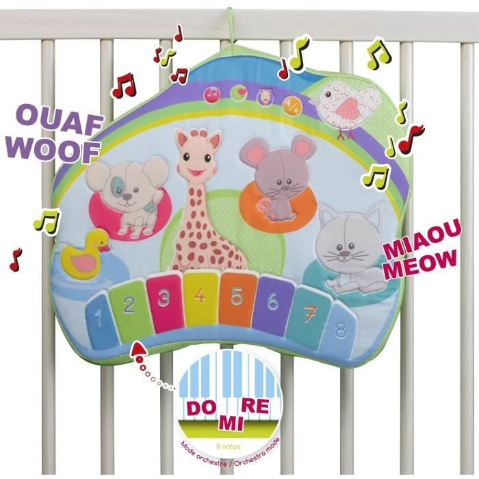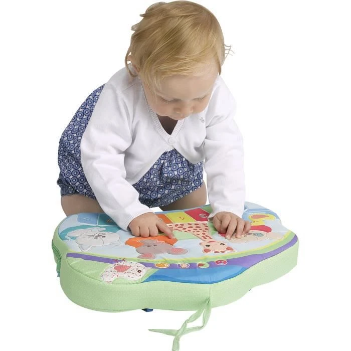 Un tableau d’éveil interactif multifonctions. Entièrement recouvert de mousse pour une sécurité optimal. Il offre 3 positions de jeu : sur les genoux, au sol, ou accroché au lit grâce aux 3 liens d’attache textile. De nombreuses activités à explorer : 6 bruits d’animaux, 6 mélodies et un piano pour que bébé compose ses propes morceaux de musique. Ludique, il permet à bébé d’apprendre la notion de cause à effet et amé