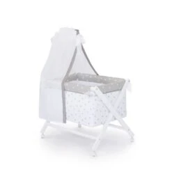 Berceau avec ciel de lit. Structure croisée en bois d´hêtre + sommier. Avec 4 roues + Matelas+ Textile avec taie d´oreiller, couette, habillage textile berceau et ciel de lit. Dimensions: Structure bois 76x51x70 cm. Ciel de lit: 55×85 cm. Couette: 80×112 cm. Une taie d’oreiller: 50×25 cm. Matelas: 49x4x75 cm. Sommier: 49×0,5x 75 cm. Composition des tissus: 100% coton.