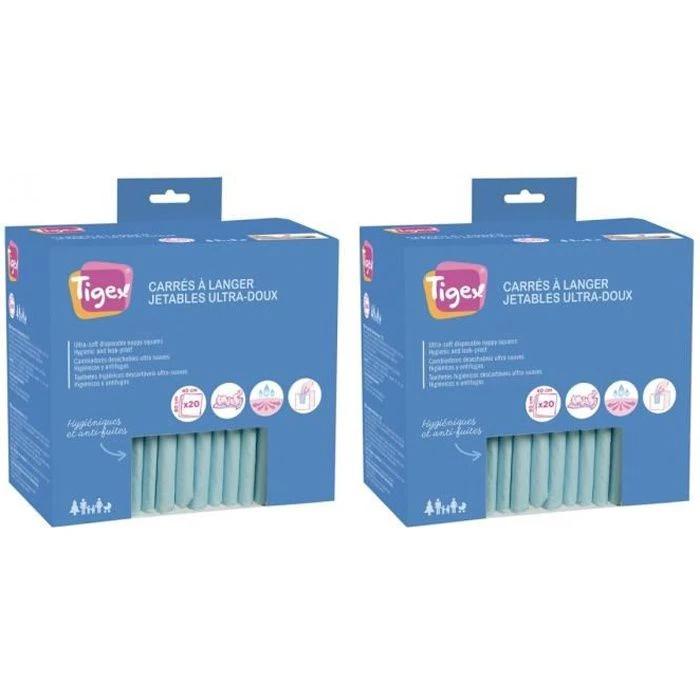 Lot de 40 matelas à langer jetables TIGEX. Les matelas à langer jetables sont indispensables pour les sorties et voyages, ils vous permettent de changer votre bébé en toute hygiène où que vous soyez. Ils sont constitués d’une face douce et très absorbante pour changer bébé en tout confort et d’une face étanche pour protéger la surface sur laquelle bébé est changé.