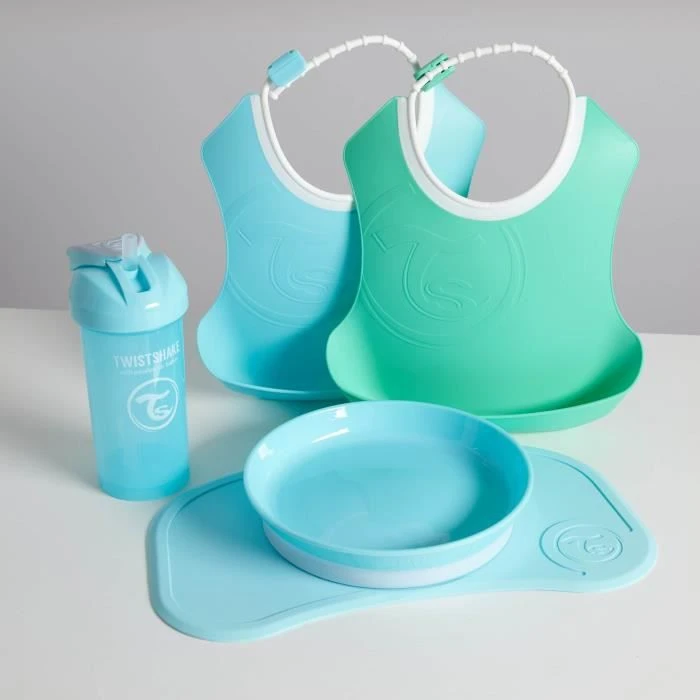 Twistshake Lot De Vaisselle – Bébé – 5 Pcs – 1x Set De Table – 1x Assiette – 2x Bavoir – 1x Gobelet -Plats De Sevrage – 6m+ – Bleu