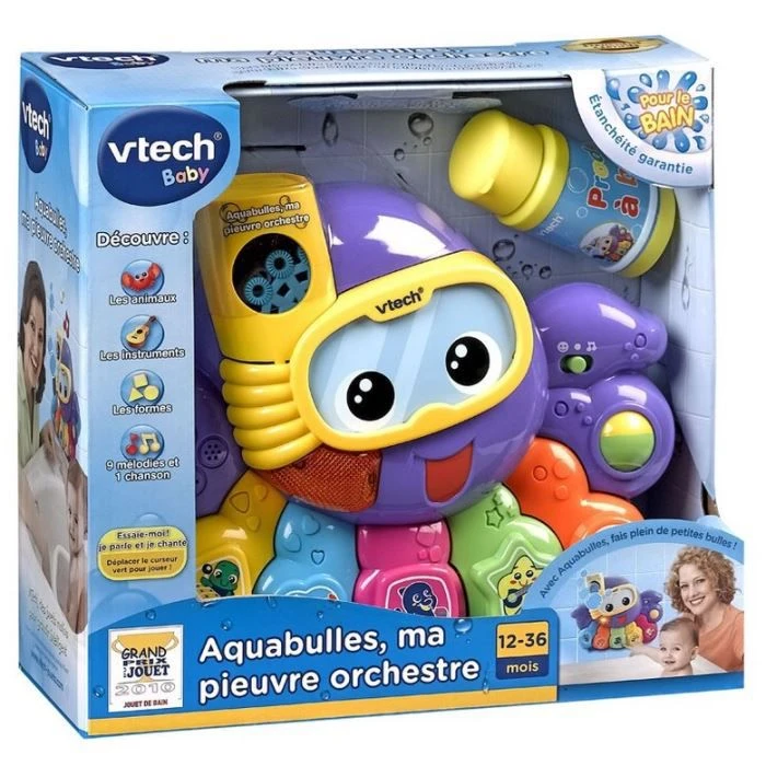 VTECH Jouet pour le bain Aquabulles Ma Pieuvre Orchestre – Une pieuvre parlante et musicale qui lance des bulles de savon dans le bain! Mixte – De 1 à 5 ans – Livré à l’unité