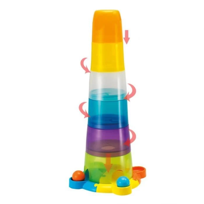 Qu’est-ce que c’est?Un jeu de construction aussi haut que la lune ! C’est un jeu de construction avec des gobelets empilables dans lequel on lance les balles du dernier niveau à travers le trou et elles tombent en faisant un parcours très amusant.Quel est le contenu?La tour dispose de 6 niveaux divisés en gobelets colorés : vert, violet, bleu, blanc, orange et jaune. Chaque gobelet a un trou et un chemin en spirale
