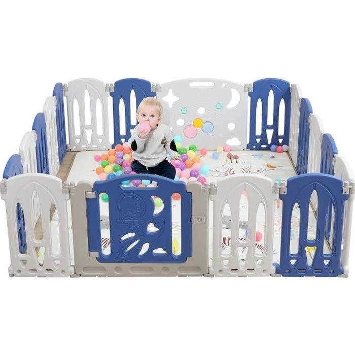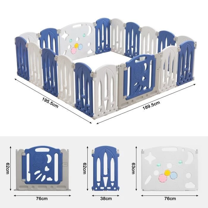 (16+2) : 16x petits panneaux + 1x plateau de jeu + 1x panneau de porte, poids : env. 15 kg, Dimensions environ : 195 cm X 189 cm.Le parc pour bébé est de haute qualité et convainc par sa longue d