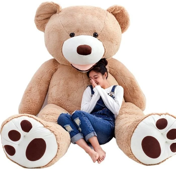 Géant nounours brun clair 160cm. Cette peluche bien convenir aux enfants plus de 3 ans.La fermeture éclaire pour sortir remplissage et faciliter le nettoyage en machine à 30 °C.Après ouvert l’emballage sous vide, c’est mieux de frapper l’article par la main ou le mettre sous le soleil un jour pour plus grand.